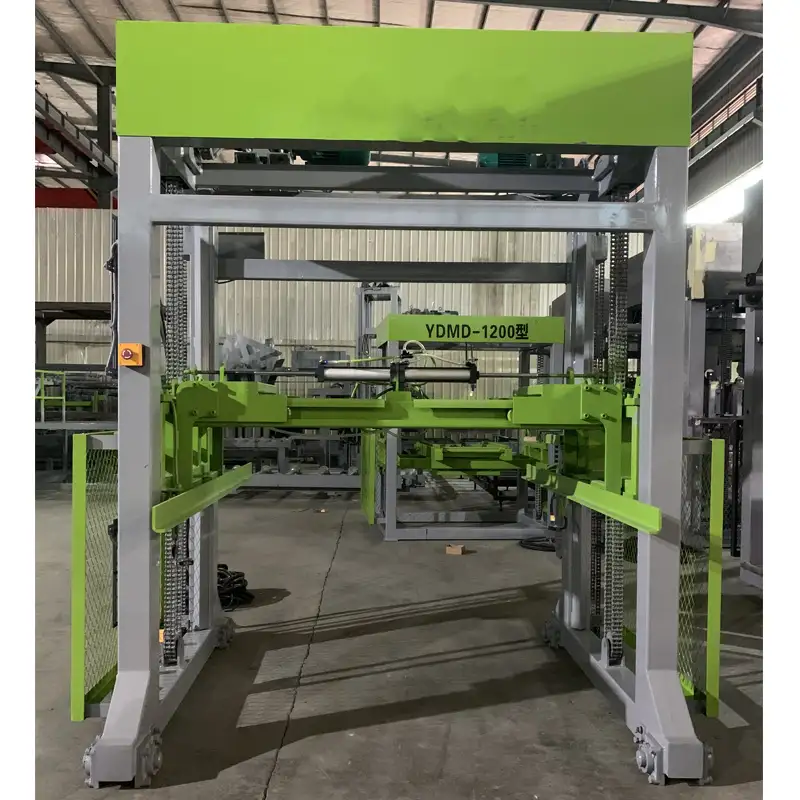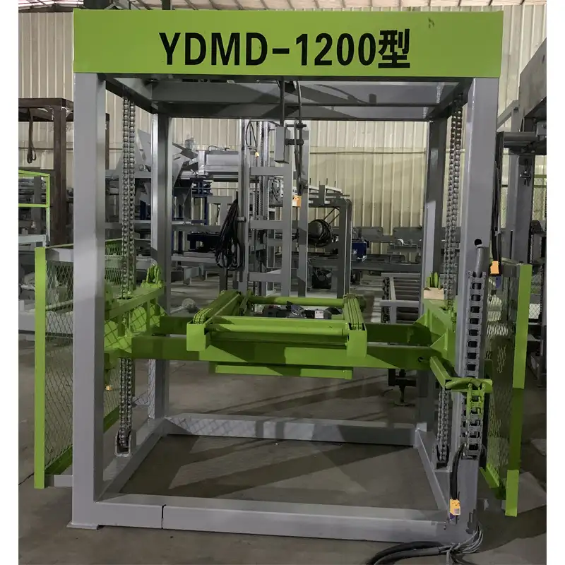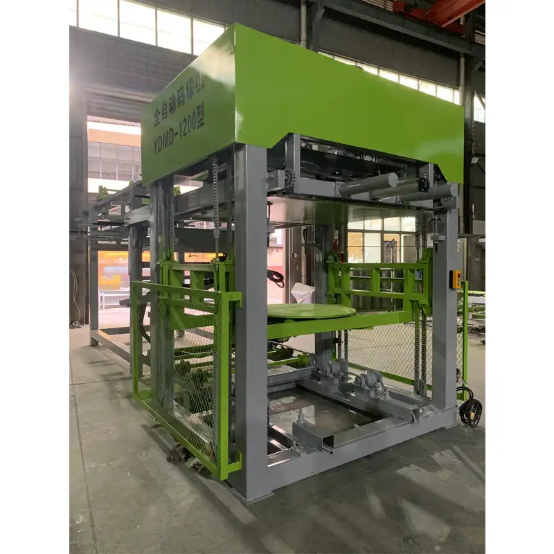 XX-MD 1200 preformed-holes dry block packing system is suitable for palletizing of dry finished blocks of simple block making production line, belonging to semi-automatic palletizing production line, which is independently set up near the product maintenance yard, and can also be connected in series in the block production line to implement on-line palletizing.